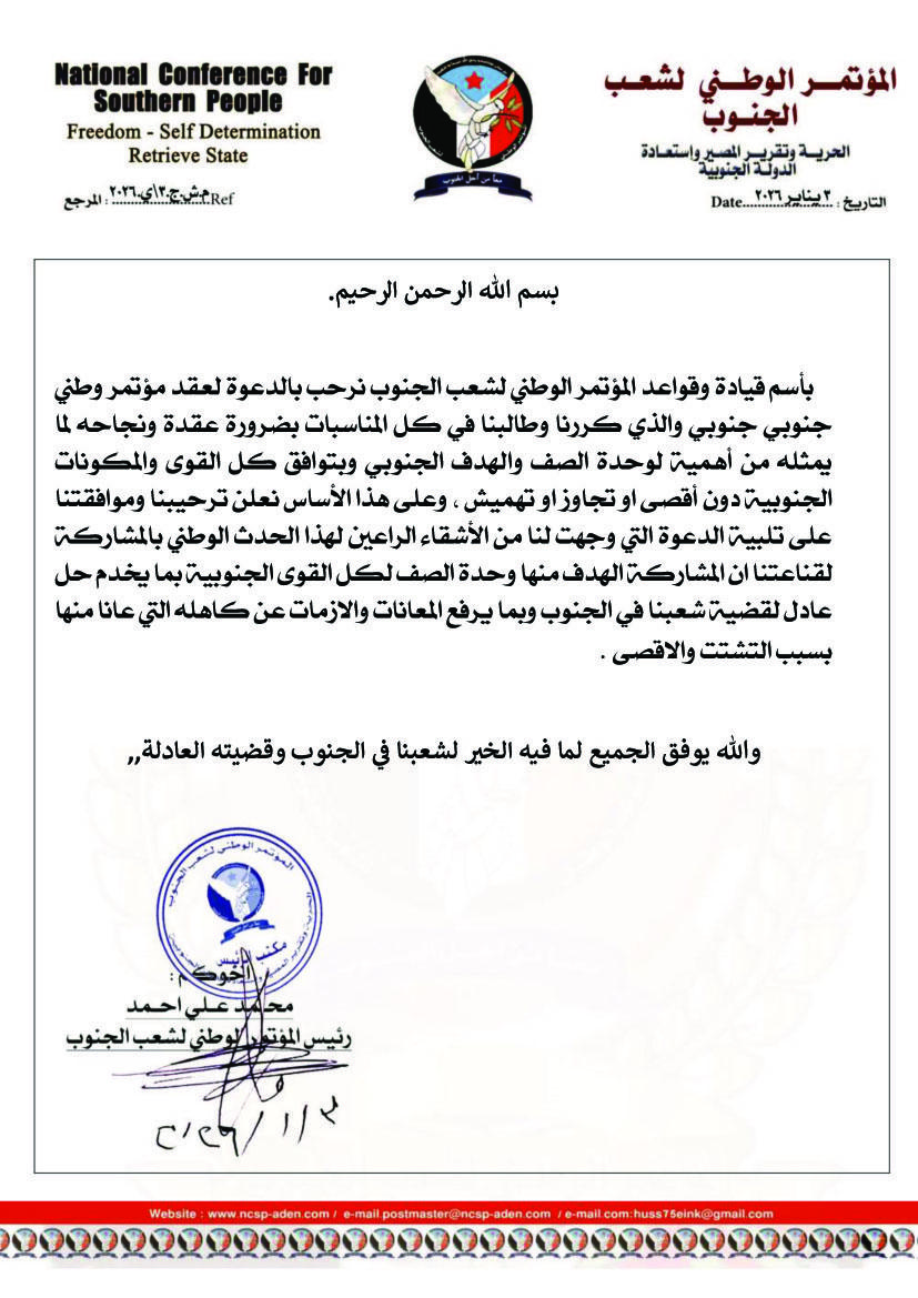 الرئيسية/أهــــــــم الأخبـــــار/القائد محمد علي أحمد يعلن موقف المؤتمر الوطني لشعب الجنوب من الحوار الجنوبي جنوبي أهــــــــم الأخبـــــار القائد محمد علي أحمد يعلن موقف المؤتمر الوطني لشعب الجنوب من الحوار الجنوبي جنوبي المؤتمر الوطني لشعب الجنوب أرسل بريدا إلكترونيا منذ 23 ساعة 0 خاص – صدئ شعب الجنوب مقالات ذات صلة الدرب .. يعزي بوفاة الزميل الصحفي عيدروس عبدالرحمن يوليو 27, 2023 القيادي الجنوبي محمد علي احمد يعزي بوفاة شقيقة علي عبدالله صالح. أبريل 12, 2025 نسخ الرابط تم نسخ الرابط المؤتمر الوطني لشعب الجنوب أرسل بريدا إلكترونيا منذ 23 ساعة 0 شاركها فيسبوك تويتر ماسنجر ماسنجر واتساب تيلقرام مشاركة عبر البريد طباعة